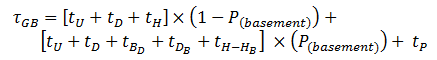 The case of multiple entrances has been dealt with by calculating the probability of going to the basement and calculating the extra time incurred when the elevator car goes to the basement [3]. The amended formula is shown below, where it is made up of two parts: the original round trip time element for floors above the main entrance and the extra time required to go to the basement multiplied by the probability of going to the basement.