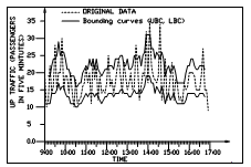 It can be seen that the two curves (UBC, LBC) nearly envelope the original time series, and that they show the shape as well as the size of the prevailing traffic.
