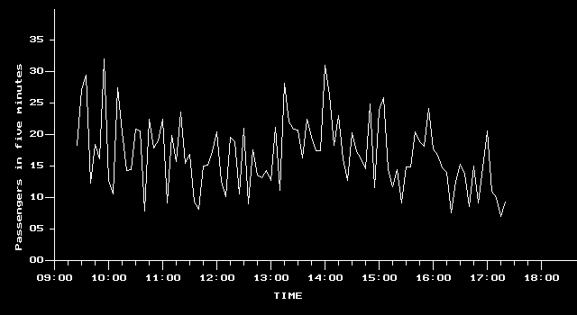 - The peak occurring at 14:00 is larger in size than the other two, amounting to 30 to 40 passengers per five minute period. This represents the worst five minute period.