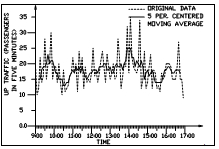 As an application of the previous method, automatically gathered raw data was processed according to the I-S-P method. The raw data was available for the four consecutive days (2-5 April 1991). One of the results is shown in Figure 3 (the other results are shown in Al-Sharif & Barney, 1991c), where the numbers of up-travelling passengers in five minute intervals were plotted against time. The numbers do not include interfloor traffic or down traffic (Al-Sharif & Barney, 1991d).