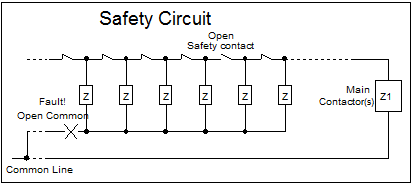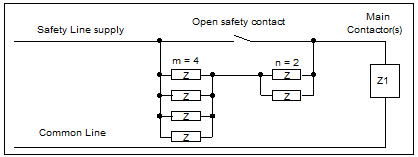 The comparative values of the equivalent impedance (Zeq) and the impedance of the main contactor(s), will could possibly lead to the operation of the main contactors, while a safety device is open, which is a dangerous situation.