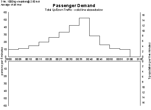 Elevate generates a one hour traffic profile which rises to the required peak Demand for 5 minutes, then drops again. Over the hour, 80% of the population are transported.