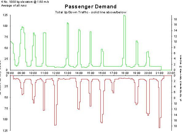 Elevate generates an example all day traffic profile based on the traffic profile presented by Mr George Strakosch in The Vertical Transportation Handbook. The profile is based on the requirements of a school building.