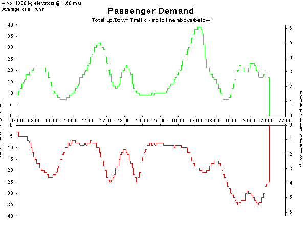 Elevate generates an example all day traffic profile based on the traffic profile presented by Mr George Strakosch in The Vertical Transportation Handbook. The profile is based on the requirements of a hotel building.