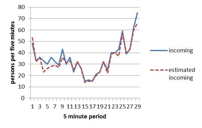 The X axis runs from 1 to 29, the number of 5 minute intervals between 10:30 and 12:50, have both been included. There were a total of 1015 passengers manually counted as incoming flow and we were able to detect 960, corresponding to an accuracy of 95%. We lost some journey data because the movement complexity of some journeys was impossible to solve. They were so complex that the symbolic equations could not be solved. It is possible that some additional rules could be added to achieve a better fit.