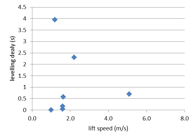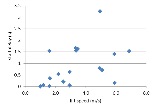 Some initial results are given in this section; we have different amounts of data for each plot as early measurement techniques yielded just some of the parameters. These results include measurements by consulting engineering firm Arup; we welcome others to contribute their measurements. For more information, and the latest results please see our lift performance web pages (6). Currently some results are “peak” rather than “best fit” values; in due course all results will be presented as “best fit” as this allows for more accurate simulation modelling.