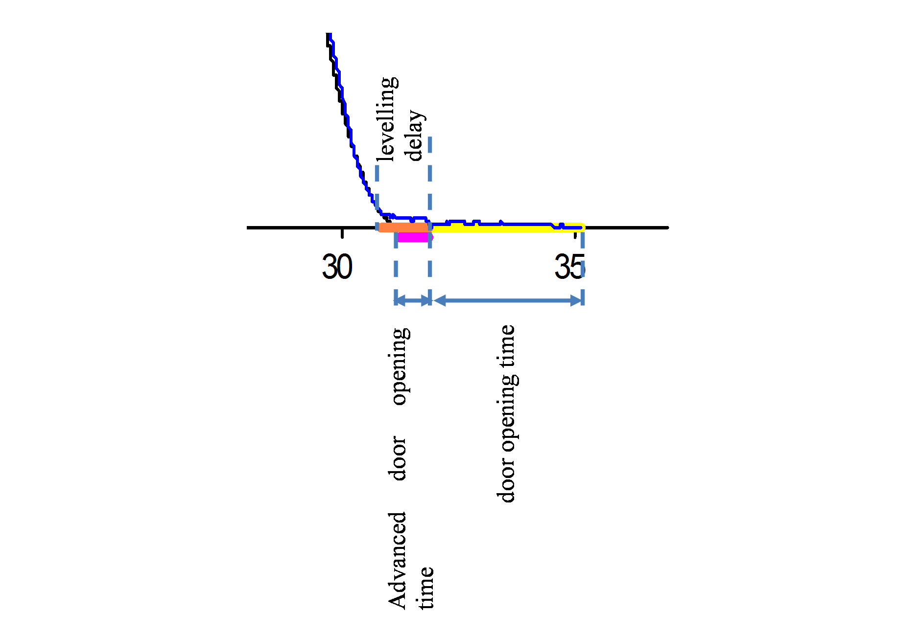 Figure 7 Close up of end of velocity plot showing levelling delay, advanced door opening time and door opening time