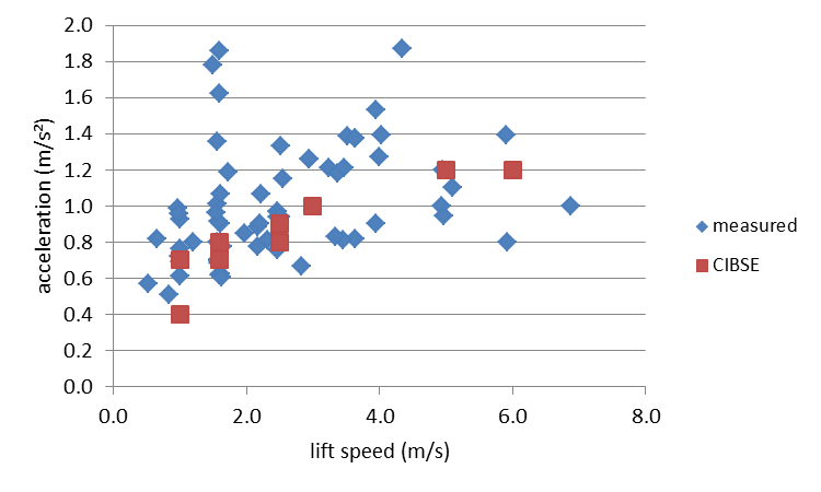 Figure 8 shows acceleration measurements; each point represents a separate lift group. Guidance from CIBSE Guide D 2010 (1) Table 3.4 is plotted on the same graph; where CIBSE suggests a range the minimum and maximum is plotted.