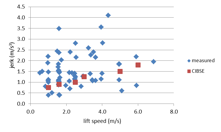 Figure 9 shows jerk measurements. CIBSE Guide D Table 3.4 recommendations are also plotted.