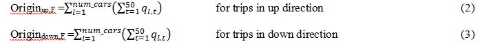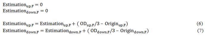 To start the estimation, the first OD is read. At this moment there is no data from the origin, so the estimation comes only from the information that can be taken from the OD. For the first interval of 50 seconds, the estimation is the value of the OD/3. After 50 seconds, an origin data set is created, so for the next estimate (from 50 seconds to 100 seconds), the origin data is taken into account. In this second estimate, we have the OD/3 value as before, but the difference between the estimation of the first interval and the actual value is added; see Eq. 6 for up direction and Eq.7 for down direction. This is used to balance the information. If most passengers from the pattern move in the first interval the second interval and maybe also the third one is consequential. The same will happen if the passengers estimated from the first interval are not as in reality.