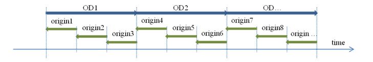 As it can be seen, the OD matrix gives future information while the origin data provides information of the recent past events. The OD data has been divided in three parts so that we can compare 3 sets of short term data with the learned profile. Before dividing the matrix, it has to be separated into up and down passenger movements as shown in Eq. 4 (up) and Eq. 5 (down). Fig. 4 represents graphically how the division of the OD is made.