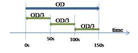In this way, the OD has been converted to the same style as the origin data. One side provides the number of up direction passengers and the other, the down direction passengers. This data has been converted into count the passengers moving from each floor in up or down directions. Now is possible to divide the OD in 3 parts, see Fig. 5. These 3 parts are exactly the same, because it is assumed that the passengers will arrive constantly in the 2.5 minute time interval.