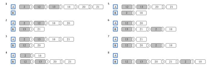Fig. 7 shows all the possible options the lifts have to serve the calls. For example, the 3rd possibility says that the 1st and the 3rd calls will be served by lift A and the 2nd call by lift B.