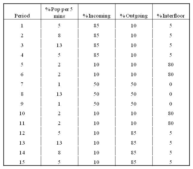 - Select a passenger profile that includes different traffic patterns: incoming, outgoing, interfloor. Table 1 shows the profile that has been used for the simulations completed for this paper. The profile has been designed to include a range of traffic patterns. The first 4 periods represent an up-peak (majority incoming traffic). Interfloor traffic is represented in periods 5, 6, 10, 11 and a lunch peak in periods 7, 8, 9. Finally down peak (majority of outgoing) is represented by the last 4 periods.
