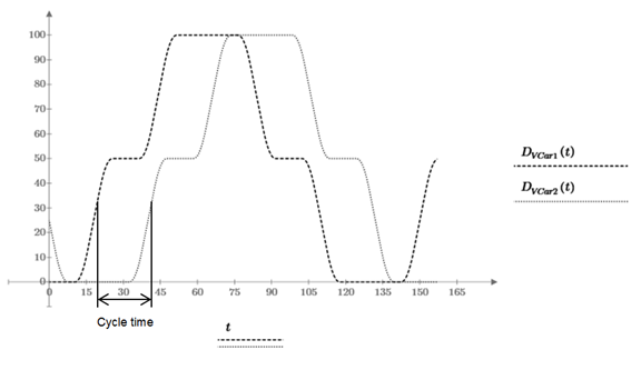 Figure 2 shows the vertical positions over time of two subsequent cars DVCar1(t) and DVCar2(t). Both cars are travelling in the up direction in the first shaft, are changing shafts at the top floor at 100m, and are travelling in down direction in a second shaft. While car 1 has already changed to the down direction shaft, car 2 is arriving at 100m in the up direction shaft. At the bottom floor the cars are changing shafts again. Both cars are stopping in each direction at an intermediate floor at the 50m level. The time between car 1 and car 2 is the cycle time. For a better overview the position of additional cars travelling in the MCLS is not shown. As the minimum possible cycle time is limited by the minimum distance during a complete round trip of the cars, critical situations need to be considered in detail. It is obvious that only one car can be at a specific position at the same time. If cars are travelling they are changing position continuously and make the position available for the next car. If cars are standing only one car can be at that position for the time the car is located at that position. To find the minimum possible cycle time over a complete round trip the stops of the cars need to be analysed in detail.
