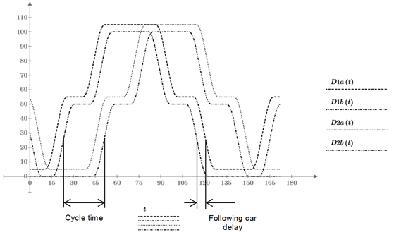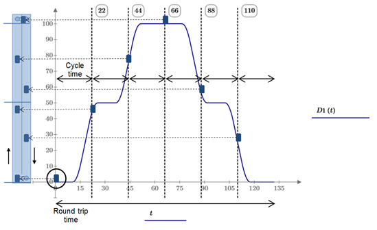 This is also illustrated with figure 7. It shows a complete round trip of a car (D1(t)). The round trip time is divided by the cycle time and shows every position of the car after a period of the cycle time. These positions equal the current position of the other cars in the MCLS at time t=0, which is shown with the two shafts of a MCLS in figure 7. With double entrance configurations and pairs of cars the number of cars is doubled.