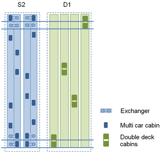 As handling capacity is limited by the passenger loading and unloading time, double entrance lobbies (two lobbies above each other) enables simultaneous loading of two cabins which increases the handling capacity. For a circulating MCLS each entrance level may have an exchanger unit enabling a parallel exchanging of two cars (see Figure 1 – S2). The cycle time is now measured between two pairs of cars (see figure 6), therefore double the number of passengers can be transported per cycle time. The cycle time will increase slightly since the arrival time and the departure time of two cars at a double lobby/floor is longer compared to a single car stopping at a single floor.