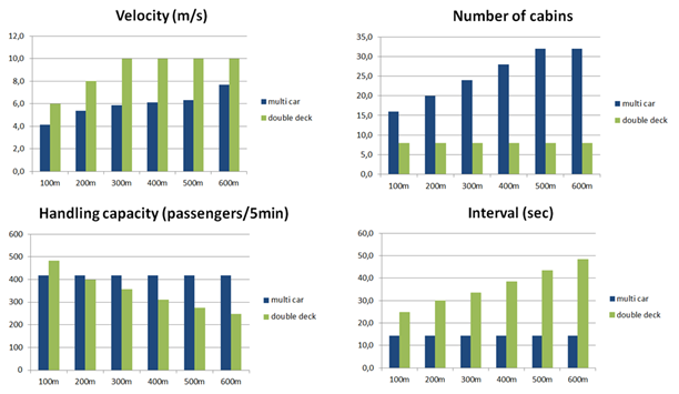 Figure 9: Comparison multi car vs. double deck depending on travel height: handling capacity, velocity, number of cabins and interval