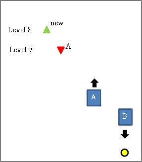 For example, consider the scenario given in Figure 3. Lift A is travelling to pick up a down landing call at level 7. Once lift A arrives at level 7 it will reverse direction. As it travels towards level 7, before it reaches its slow down point, a new up call is registered at level 8. The dispatcher determines the best solution is for lift A to change its target floor from 7 to 8 so that it can serve the up call at level 8 (and its subsequent car call) before reversing and serving the down landing call at level 7.
