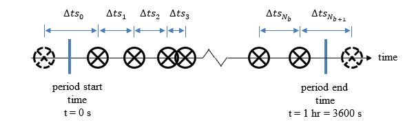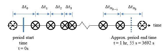 Continuing placing all the batches on a time line using Equation 3, see Figure 4. The period end time is only approximate as the calculation of inter-arrival times includes a random element.