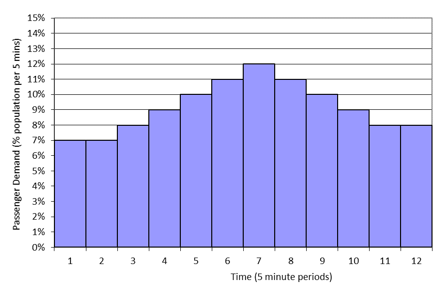 CIBSE Guide D [3] recommend designers use templates to reflect the rise and fall of passenger demand at peak times, see Figure 2, but repeat the simulation multiple times (typically 10) with different sets of passengers. Start and end effects can be disregarded as the designer reports results for just the peak 5 minutes of the profile.