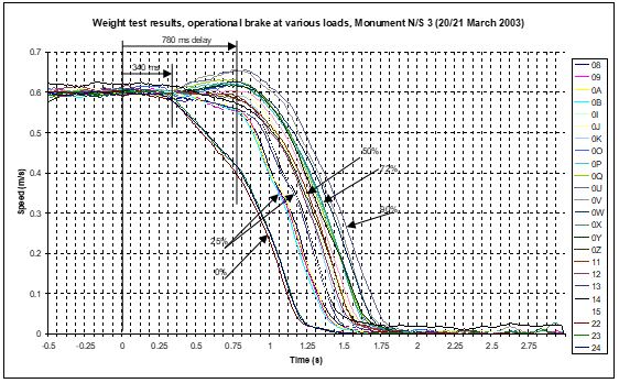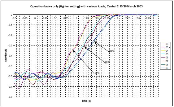 The results of the weight tests have been summarized as speed versus time plots for the stopping escalator with various loads. The plots have been shown for HDM10 type (Figure 2), RTV-HD type (Figure 3), HDMS type (Figure 4) and the Compact type (Figure 5).