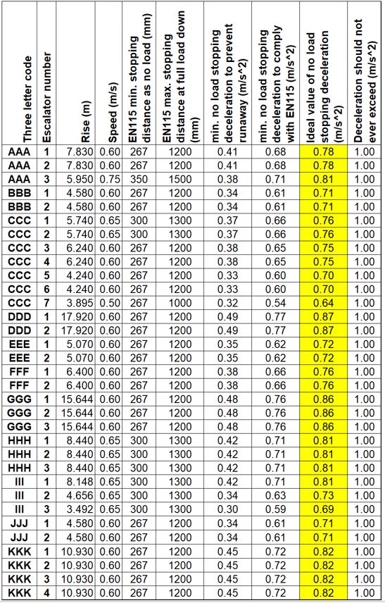 These recommended deceleration values have been compiled into a table that contains the maximum and minimum allowable deceleration values. The maximum limit ensure that the escalator stop is not too abrupt (and thus cause passenger falls). The minimum limit ensures that the escalator does stop within the stipulated distance (and thus comply with the requirements of the European standard EN115:2008).