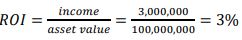 In the case of buildings, income represents the rents collected from tenants minus operating expenses and asset value is the value of the lifts and all other building components. If an investor places €1,000 in a bank account and the bank pays the investor €30 per year in interest, then the investment has an ROI of 3%. If an investor builds a building for €100,000,000 and receives an income of €3,000,000 after all expenses, then the building investor also has an ROI of 3%. Applying Equation 1 to the building example yields the following results: