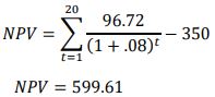 Since €599.61 is greater than 0, the offer should be accepted. Another way to look at this result is to add the NPV to the IO; this yields a value of €949.61. If the regenerative drives were offered for €949.61, the energy savings of €96.72 would have returned a NPV of 0, indicating that an investment of €949.61 would have yielded the required ROI of 8%.