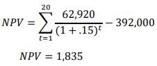 The building management and their lift consultant decide to evaluate the economic feasibility of the lift modernization. They will use the NPV method and will assume a 20 year life and a rate of return of 15%. The rate of return was based on financing the modernization. The NPV based on these values appears as follows: