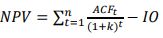 The Net Present Value calculation converts future cash flows to today’s value. NPV is used to accept or reject an investment proposal. Since the NPV equation includes the minimum required rate of return, k, an NPV value of 0 or greater indicates that the investment delivers the required rate of return [1].