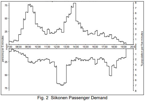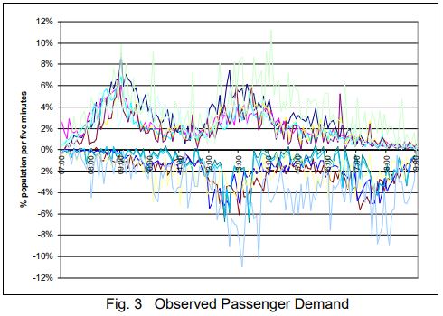 Figure 3 shows the results of lift traffic surveys for seven separate groups of lifts [6]. The surveys were undertaken applying a methodology defined by Peters and Evans [7]. The passenger demand is normalised against observed population to allow results to be compared between buildings