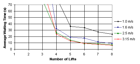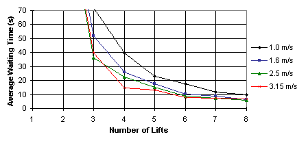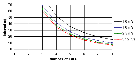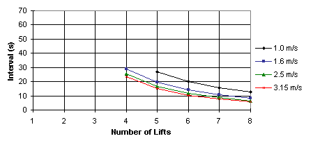 With a design interval of 30 seconds, four lifts at 1.6 m/s is the minimum specification choice based on these analyses.
