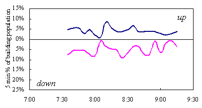 The building was surveyed during the busiest peak period, which is normally the morning in hotels. At that time the traffic was a combination of passengers to/from breakfast, exiting the building, and travelling to the conference facilities. A summary of the traffic travelling up and down the building is plotted in Figure 8.