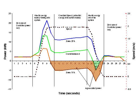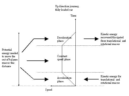 3. At the end of the acceleration phase, no more kinetic energy is needed as the speed is constant. For cars travelling up: if the car plus its load is heavier than the counterweight, then the system is drawing and storing potential energy. If the counterweight is heavier, then the system is returning potential energy. Similarly for cars travelling down, potential energy may be stored or returned.
