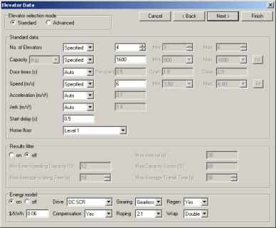 Figure 7 shows the Elevator Data input screen for the simulation model in Standard mode. For basic energy modelling, the user can simply select the drive. Inputs for gearing, regeneration, compensation, roping and wrap can selected, or left in Auto mode. In Auto mode, the program selects intelligent defaults for the inputs.