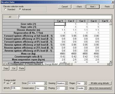 Figure 8 shows the Elevator Data input screen in Advanced mode. In this mode, the user can specify every input to the model. This includes parameters like the mass of the car, efficiencies, counterbalancing ratio, rope length, etc. There is a speed fill button to fill the table with default data based on the Standard mode inputs.