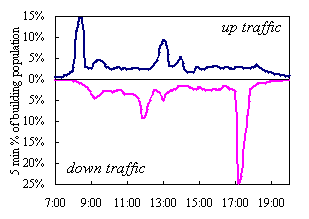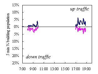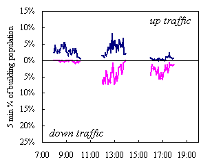| Building | Traffic period | Peak 5 min % building population using lifts |
