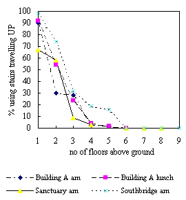 In the Building C (Figure 5) survey, use of the staircase was virtually nil in spite of the lifts being heavily loaded and long passenger waiting times; the main staircase was an unattractive fire escape sited well away from the lift lobby. Figure 11 shows the associated stair usage for the BRE[7] and Building A (Figure 3) surveys