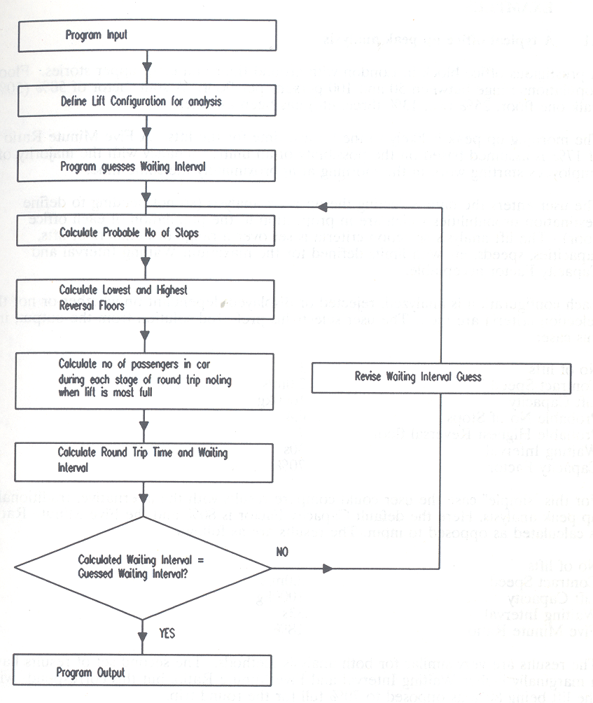 One occasional user problem is that zero Waiting Interval and Capacity Factor results are given when the program is asked to analyse an over-lifted solution. If there is insufficient traffic to keep the lifts busy, in effect there will normally be a lift left waiting at the main terminal floor unused - the iterative value of Waiting Interval tends to zero, as would be the case in real life.
