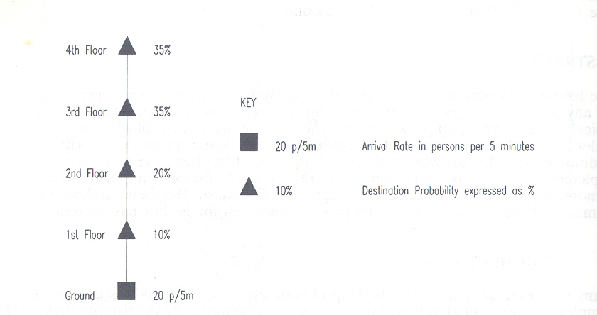 The author's introduction to lift traffic analysis was through writing a lift simulation program, as noted in the biography of this paper. Any analytical analysis for the general case must define lift passenger traffic in a similar way to simulation models, identifying the rate of passenger arrivals at each lift landing station and the passengers' probable destinations. To define the passenger flow completely we need two terms:
