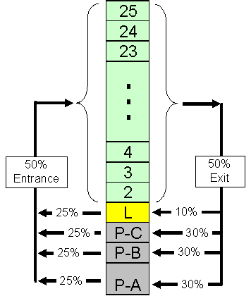 With a single entrance, the example in Section 3 is clearly the simplest of traffic scenarios. It is not totally out of the question to expect that a luxury residential building will have parking garage levels within the structure. Therefore, we took the 25-story example and added three levels of above ground parking. We assume that the same requirements would apply … peak two-way traffic at 8% with half of the traffic returning to the building and the other half leaving the building. The important difference, however, is that now there are four different levels of entrance and exit: main Lobby and parking levels P-A, P-B, and P-C. It is now incumbent on us to determine the distribution of traffic to and from each level. With reference to Figure 4, we assume somewhat arbitrarily that entrance traffic is divided equally amongst the four levels. In contrast, the exit traffic is assumed to be different where only 10% of exiting passengers use the main Lobby level. This reflects the situation where many fewer people leave the building by walking out on foot from the main Lobby than by automobile from the parking levels.
