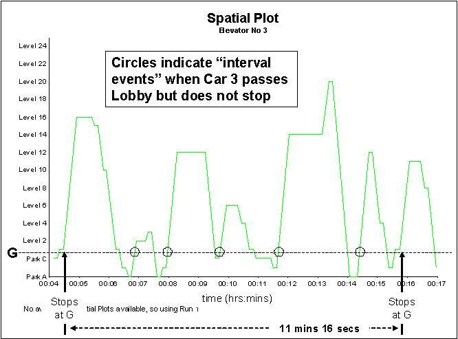Simulation results for this case tell a similar story to the case of above ground parking. The reported AWT was 18.3 seconds, and the Interval was 136 seconds. As before, the extra long interval is explained by the fact that the cars do not make regular stops at the Lobby level where “interval events” are logged. Figure 8 shows that Car 3 left the Lobby in the up direction at time 00:04:28. The next time that it stopped at the Lobby and traveled upward was at 00:15:44. This represents a time between “interval events” of more than 11 minutes.