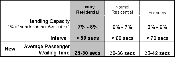 With this approach, the traffic analyst would use simulation to determine the Average Passenger Waiting Time for the required two-way traffic pattern and simply compare the reported value of Average Passenger Waiting Time to the limits in Table 3. The implication of this recommendation is that for the case of residential buildings, the traditional concept of Interval is of little or no interest. We should focus on what is important to the passenger, which is Average Passenger Waiting Time.