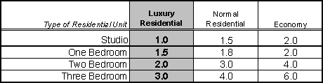 To fully specify the traffic volume in terms of the number of passengers per 5-minutes, it remains to provide an estimate of the building’s population. Population is most often estimated as a function of the number of bedrooms per the following table.