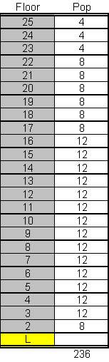 Consider a proposed 25-story true luxury residential building for which the estimated population per level is small, varying from 4 persons to 12 as shown on Figure 1. The total population of the building is estimated at 236 residents.