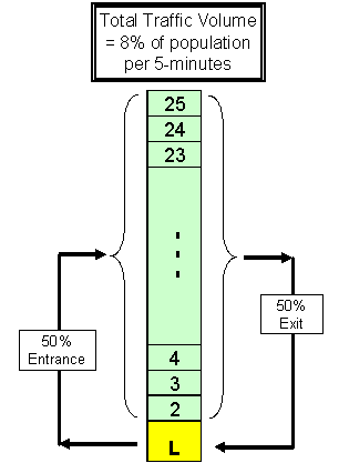 A traffic pattern (shown in Figure 2) was established in which it was estimated that the heavy two-way traffic referenced in the requirements occurred over a 20 minute time period. This type of traffic reflects the typical peak late afternoon traffic period referenced in the requirements. Per the requirements, during this period some 8% of the population calls for elevator service in each five minute period. For this building, this amounts to 19 passengers (0.08 × 236 = 18.88) per five minutes. Some 50% of the passengers are assumed to be calling for elevator service to travel upward from the Lobby to their floor. At the same time, the other 50% of passengers are already on their residential floor and demand elevator transportation to carry them downward to the Lobby.
