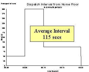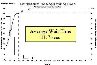 Elevate simulation experiments were run for several 20-minute periods and the following results were observed. Average Passenger Waiting Time was 11.7 seconds, and the Average Interval was 43 seconds. These results are shown in graphical form in Figure 3.