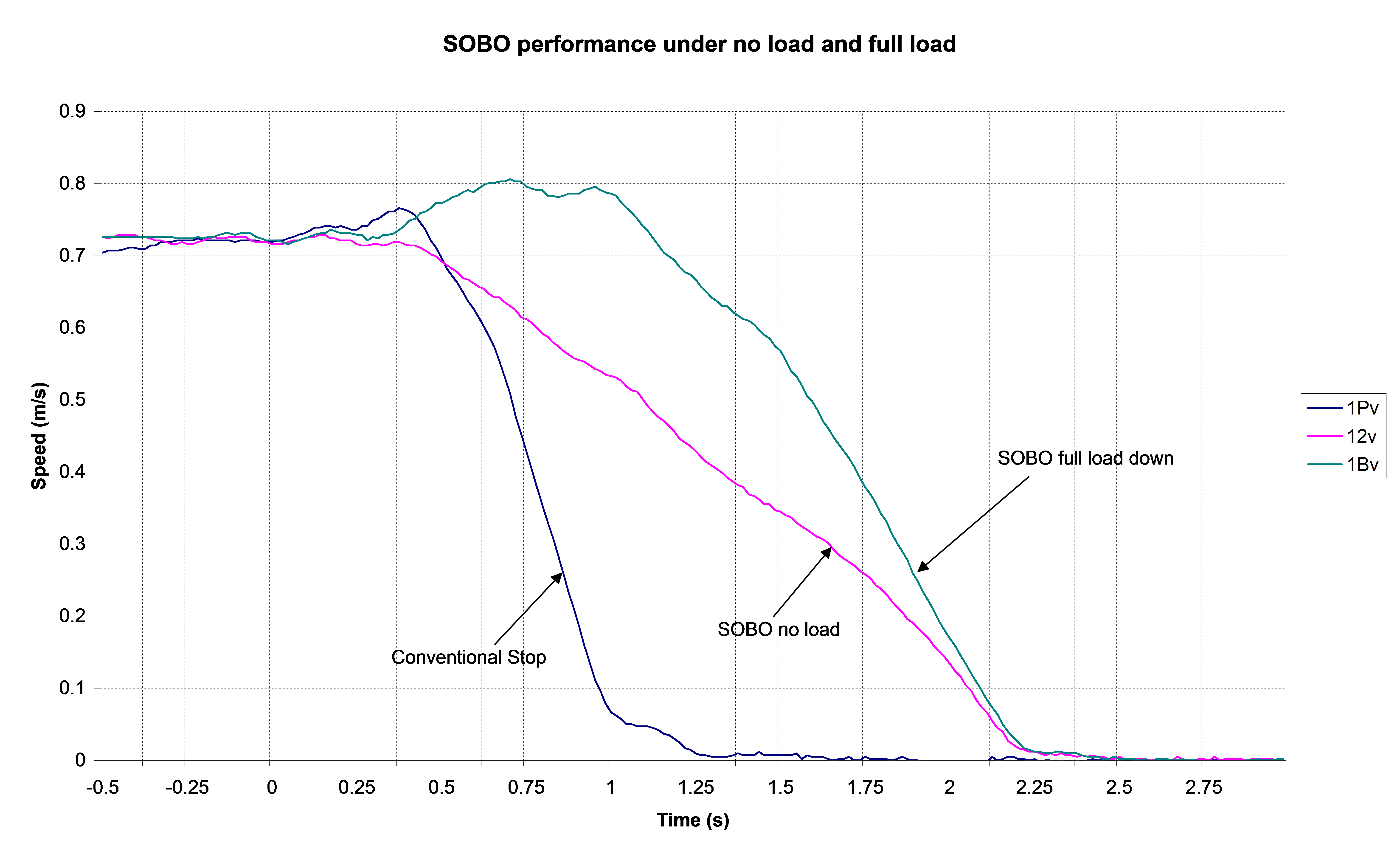 The tests results are shown in graphical format in Figure 9 (that shows the comparison between conventional stops and intelligent braking stops at no load) and in Figure 10 (that shows the no load to full load variation of the intelligent braking system).