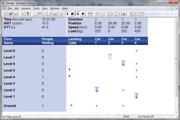 The main display area provides a graphical representation of the building. When a simulation is running, the elevators and calls placed on the system are displayed. When a Round Trip Time calculation is being performed, a progress report is displayed. This is discussed in more detail in Running the Analysis. Once the analysis is complete, the main display area provides a preview of the data and results that can be printed. This is discussed in Viewing the Results